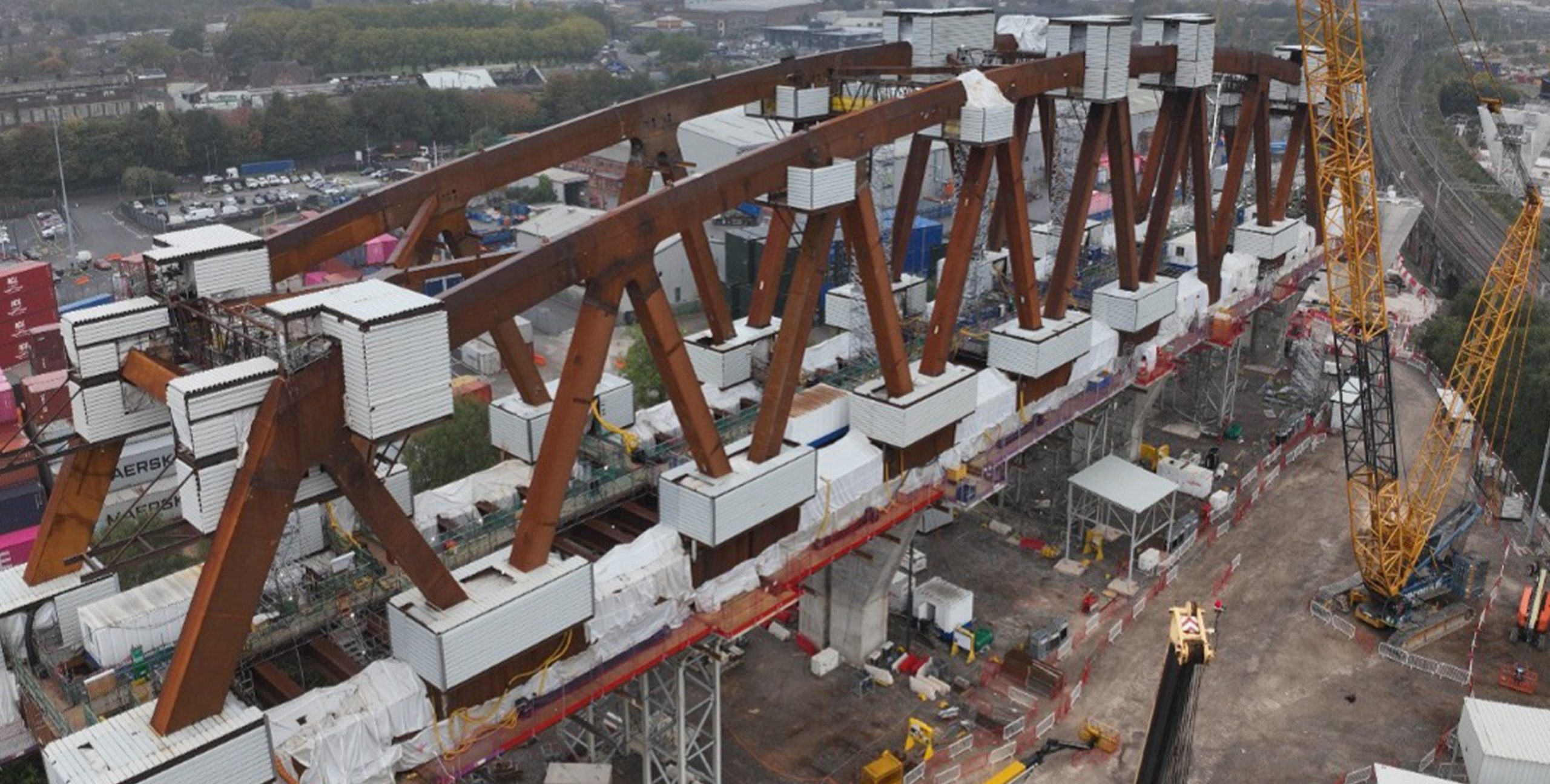 The Curzon 2 viaduct is the tallest viaduct on the HS2 project. Assembled on top of the piers for the Curzon 1 viaduct, the 25m high weathering steel truss will be slid into position across the adjacent Cross-City line in Summer 2026.